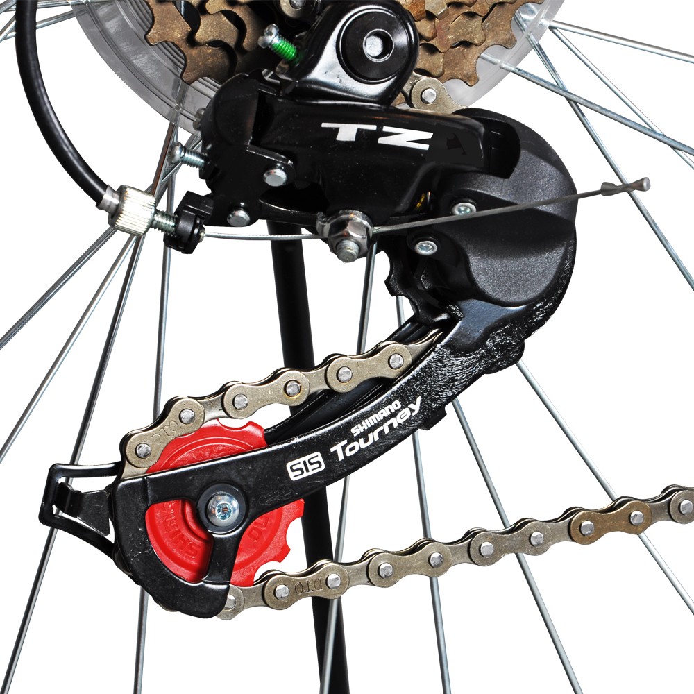 18 brzina, čelični ram 22", dimenzija točka 26" obruč-dvozidni, zadnji menjač-Shimano TZ 50, kruta vila, V-brake kočnice