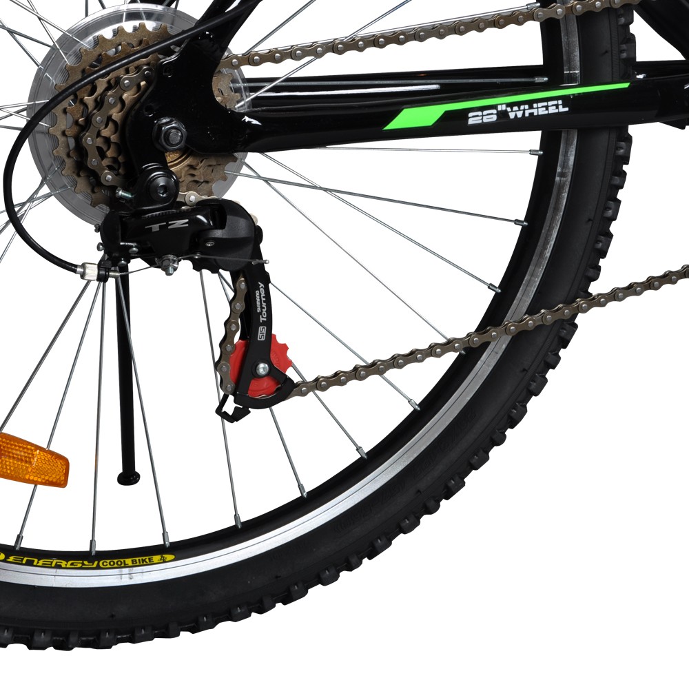 18 brzina, aluminijumski ram 17", dimenzija točka 26", obruč-dvozidni, zadnji menjač-Shimano TZ 50, vila sa amortizerom, V-brake kočnice