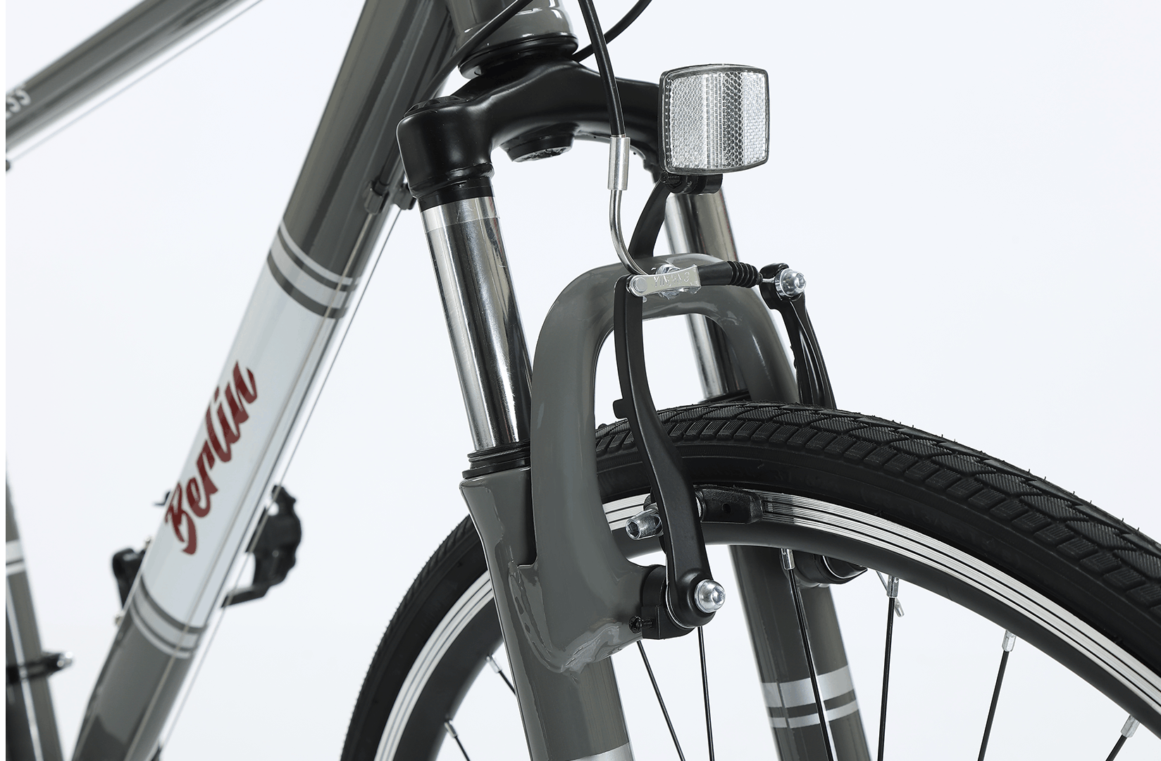 Ravan čelični upravljač, udobno MTB sedište i pedale sa reflektorima doprinose ergonomiji i bezbednosti. Zadnji čelični nogar omogućava lako parkiranje, čineći BERLIN 28" praktičnim i pouzdanim gradskim saputnikom.
