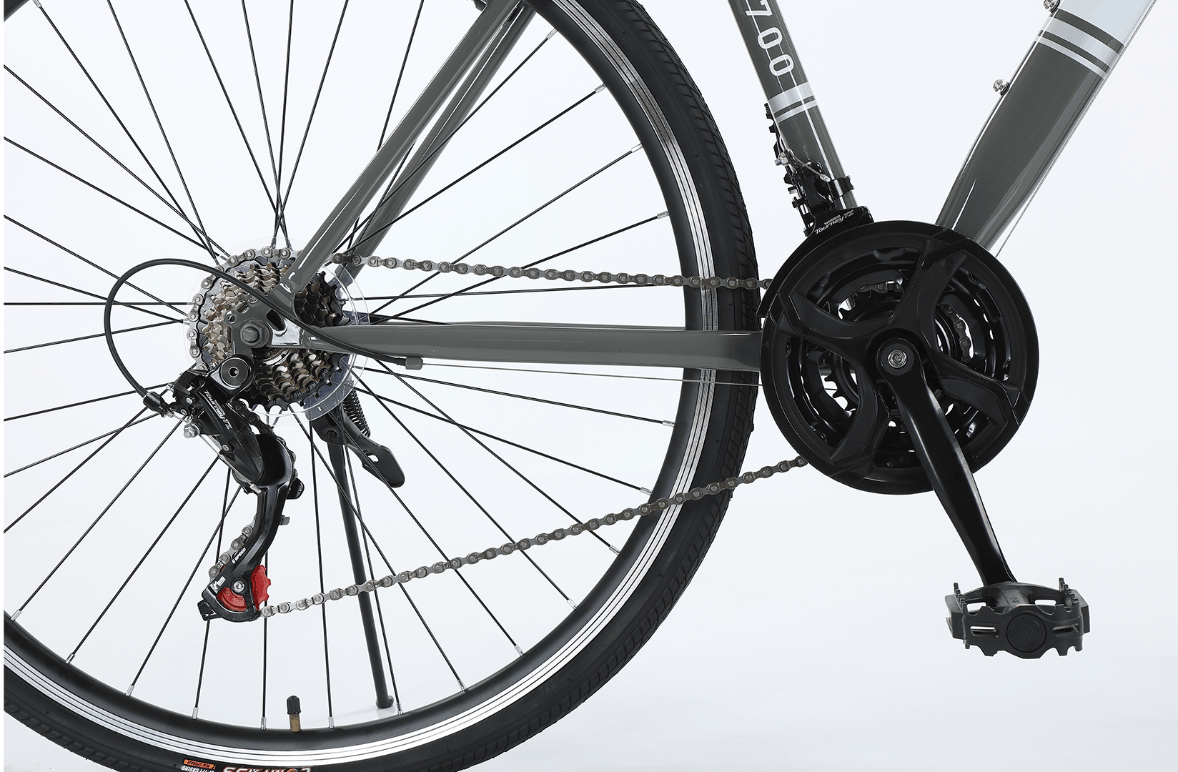 Bicikl je opremljen Shimano sistemom sa 21 brzinom (3×7), što omogućava lako prilagođavanje različitim nagibima i tempu vožnje. Pouzdane aluminijumske V-kočnice pružaju precizno i sigurno kočenje u svakodnevnoj upotrebi.