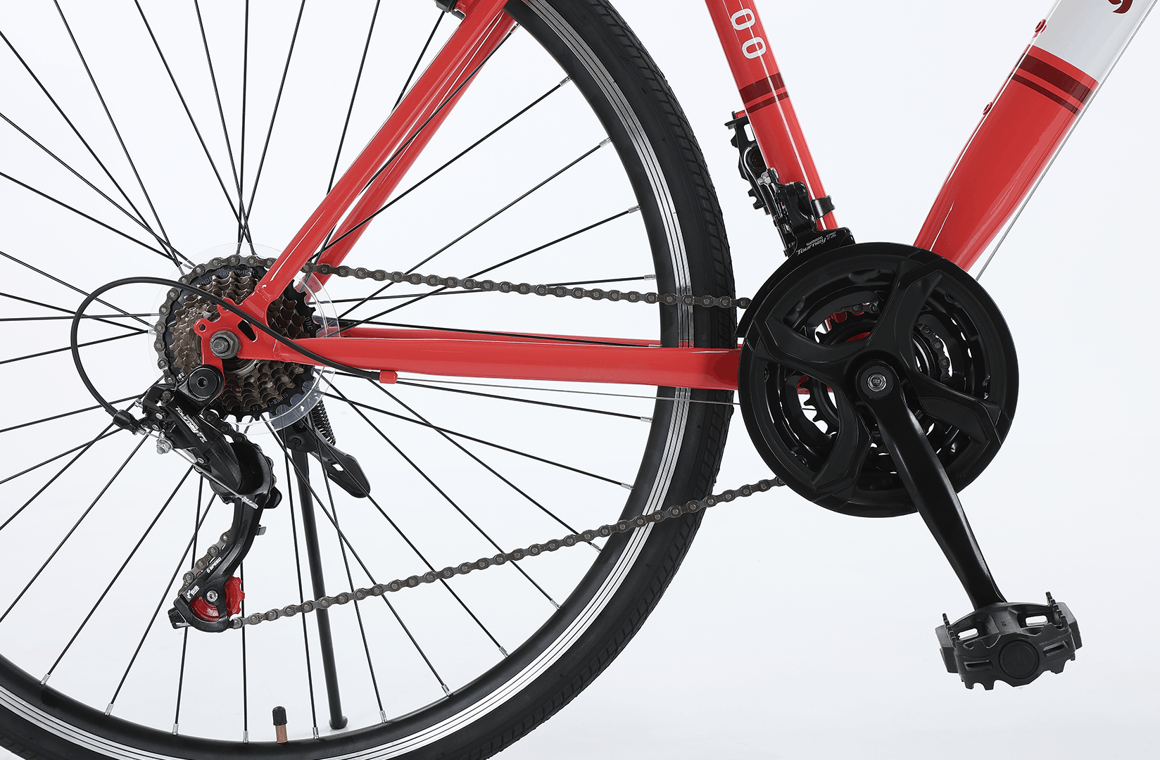 Bicikl je opremljen Shimano sistemom sa 21 brzinom (3×7), što omogućava lako prilagođavanje različitim nagibima i tempu vožnje. Pouzdane aluminijumske V-kočnice pružaju precizno i sigurno kočenje u svakodnevnoj upotrebi.